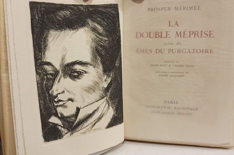 LA DOUBLE MÉPRISE suivie des ÂMES DU PURGATOIRE Prosper Mérimée Eau-forte originale de André Jacquemin volume in-8 broché en parfait état, dans son emboîtage d'origine. 252 pp. En parfait état, Exemplaire numéroté Imprimerie Nationale/André Sauret, France, 1953