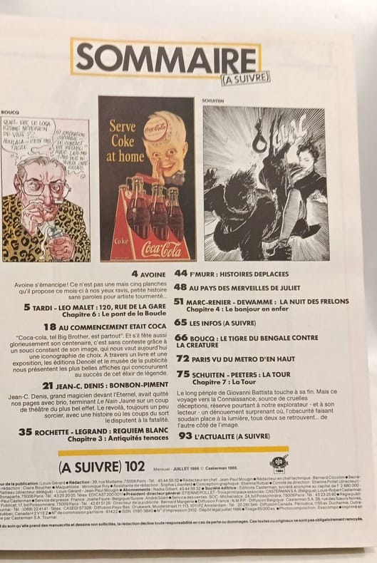 102 : JEAN-C. DENIS BONBON-PIMENT - Une histoire qui fait grimper la température - 103 : MUNOZ-SAMPAYO NICARAGUA - Le grand retour d'Alack Sinner, le privé new-yorkais - 104 : MICHELUZZI BAB-EL-MANDEB - Quand dix-sept ans de bons et loyayx services partent en fumée... - 105 : Un numéro tout feu tout flammes - ROSINSKI VAN HAMME - Le grand pouvoir du Chninkel - Quand le ciel épouse l'enfer... - 106 : Au fil des jours et des saisons L'ALMANACH DE JEAN-CLAUDE SERVAIS - OCTOBRE ANGELIQUE - 107 : ALEX ET DANIEL VARENNE - BOBBY LYNN - REPERAGES - 11 AUTEURS SUR LE TERRAIN. Classification Dewey : 843.061-Albums BD