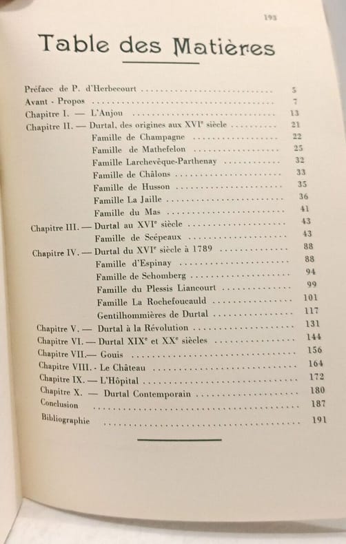L'Anjou - Durtal des origines au XVIe siècle (Familles de Champagne, de Mathefelon, Larchevêque-Parthenay, de Châlons, de Husson, La Jaille, du Mas) - Durtal au XVIe siècle, famille de Scépeaux - Durtal du XVIe siècle à 1789 (Famille d'Espinay, de Schomberg, du Plessis Liancourt, La Rochefoucauld - Gentilhommieres de Durtal) - Durtal à la Révolution - Durtal XIXe et XXe siècles - Gouis - Le chateau - L'Hopital - Durtal contemporain - Conclusion et bibliographie - NB : La création de la commune est en lien avec la fondation de la forteresse de Durtal en 1040 par le comte d'Anjou Foulques Nerra. Au Moyen Âge, Durtal dépendait de la sénéchaussée de Baugé. Sous l'Ancien Régime et jusqu'à la Révolution française, Durtal dépendait du Pays d'élection de La Flèche. (wikipedia) Remise de 20% pour toutes commandes supérieures à 200 €
