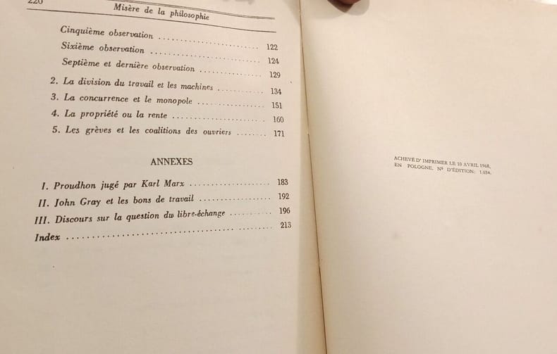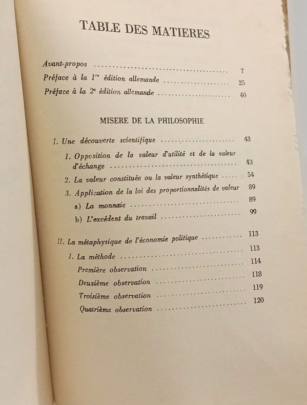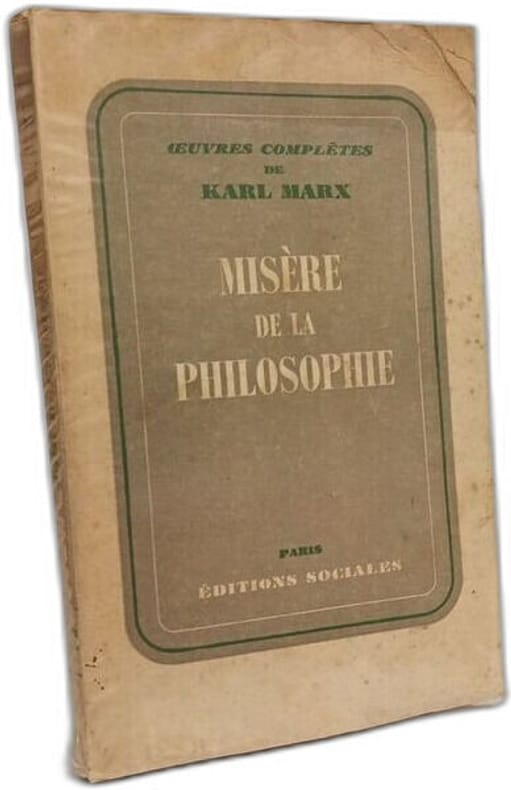 Coll. "Bibliothèque socialiste internationale", Paris, éd. Marcel Giard, 3e édition, gd. in-12, demi-chagrin brun foncé, plats papier marbré "cailloux" rouge et brun, fleurons, double filets, auteur et titre dorés sur dos lisse, couverture d'origine conservée, reliure de l'époque, XXX - 272 pp., préface de Friedrich Engels, table des matières, signature sur la première de couverture de H. Hurtel, portrait de Marx extrait d'un article de journal collé sur la page face au titre ainsi qu'une petite "vignette" reprenant un texte de H. Hurtel en 1920, "Ouvrage paru en juin 1847 à Bruxelles en son exil. Son titre constitue une reprise inversée de l'ouvrage de Proudhon, Philosophie de la misère. Le texte est écrit en français bien que la plupart des œuvres de Marx soient écrites en allemand. Il s'agit d'une critique, reprenant point par point les arguments avancés dans Philosophie de la misère et tentant de les démonter ou de montrer qu'ils enfoncent des portes ouvertes". Reliure agréable. Pas courant Très bon état de la reliure; papier uniformément jauni avec quelques très petites rousseurs éparses