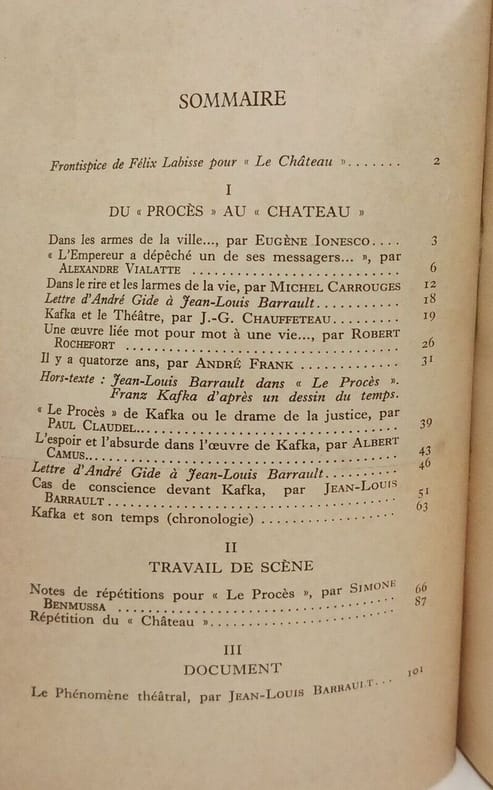 Julliard 1961 In-12 Frontispice . Analyse de l'oeuvre de Kafka par Camus, Claudel, Barrault. Travail de scène et reproduction de lettre manuscrite, photo d'un dessin . Théâtre .-127 p., 150 gr.