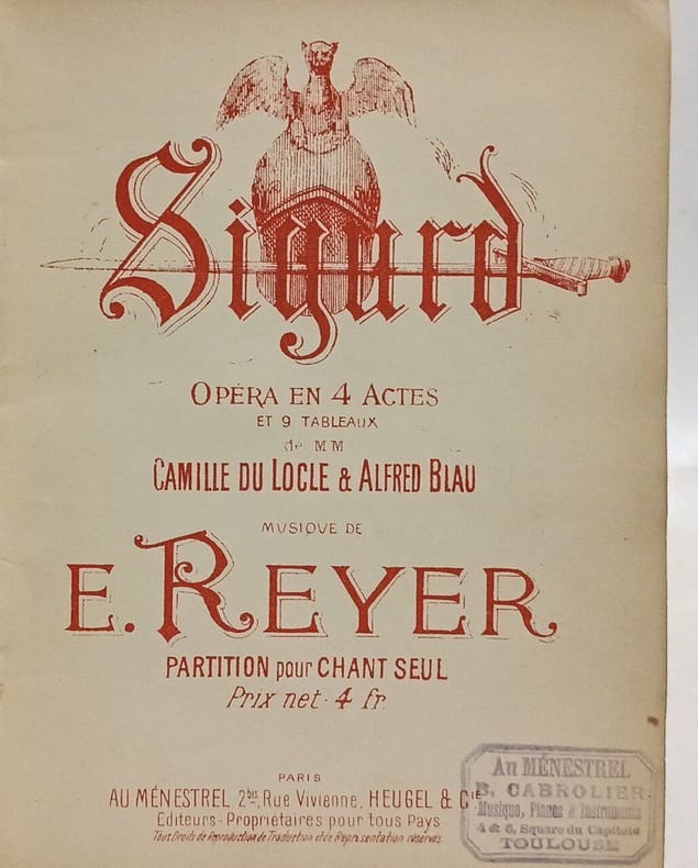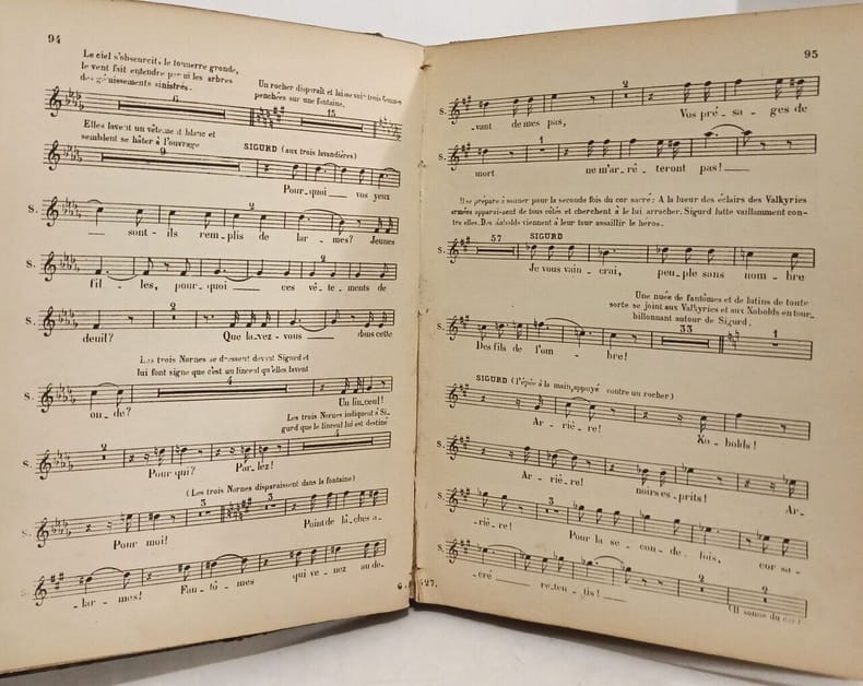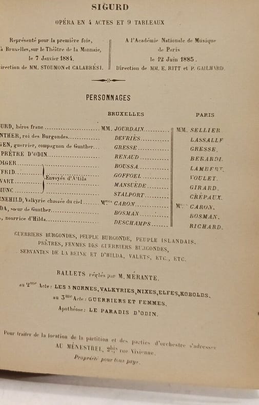 1 vol. in-12 reliure demi-basane verte, Les Huguenots. Opéra en cinq actes (Eugène Scribemusique de Meyerbeer), Tresse et Stock, Paris, 1886, 81 pp. - Esclarmonde. Opéra romanesque en quatre actes et huit tableaux dont un prologue et un épilogue (Alfred Blau et Louis de Gramont, musique de Massenet), G. Hartmann et Cie, Paris, 1889, 59 pp. et 2 ff. - Sigurd. Opéra en quatre actes et neuf tableaux (Camille du Locle & Alfred Blau, musique de Reyer), Presse et Stock, Paris, 1885, 60-7 pp. - Le Cid (d'après G. de Castro & Corneille, d'Ennery, Gallet et Blau, musique de Massenet), Tresse & Stock, Paris, 1886, 51 pp. - Opéra en quatre actes et dix tableaux (D'Ennery, Louis Gallet & Edouard Blau) - Martha ou le Marché de Richmond. Grand-opéra (Semiserio) en 4 actes et six tableaux (Paroles françaises de M. Louis Dauglas, musique de Florow), J.-A. Lelong, Bruxelles, 1862, 59 pp.
