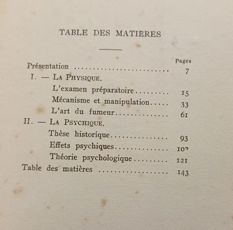 Table des Matières: La Physique: L'examen préparatoire - Mécanisme et manipulation - L'Art du fumeur. - La Psychique: Thèse historique - Effets Psychiques - Théorie Psychologique.