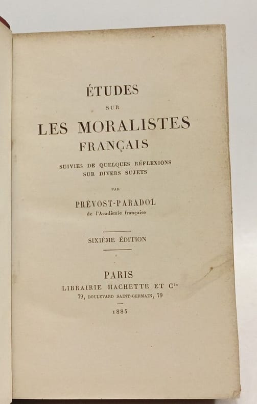 Paris Librairie de L. Hachette et Cie 1865 in 12 (18x12) 1 volume reliure demi chagrin rouge ancienne, dos à nerfs, VII et 303 pages. Etudes sur: Montaigne; La Boëtie; Pascal; La Rochefoucauld; La Bruyère; Vauvenargues; De la chaire à propos de la Bruyère; De l'ambition; De la tristesse; De la maladie et de la mort. Prévost-Paradol, Lucien Anatole 1829-1870. Deuxième édition. Bel exemplaire ( Photographies sur demande / We can send pictures of this book on simple request )