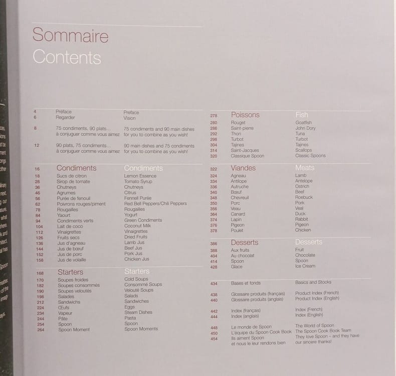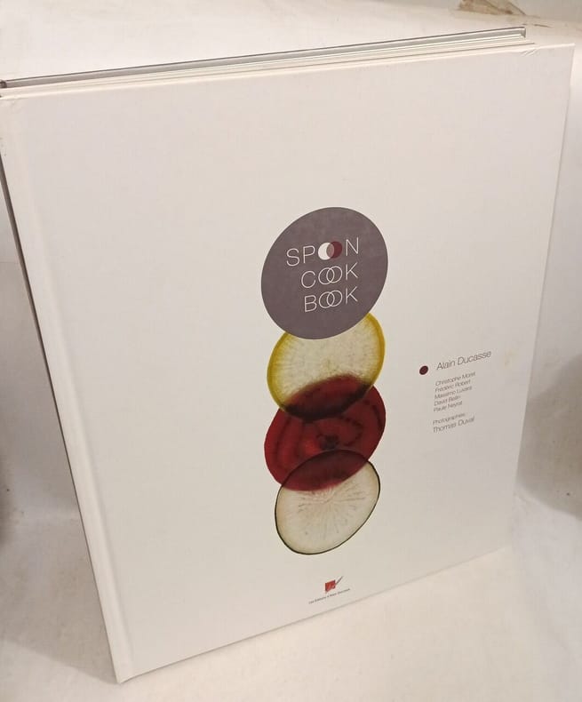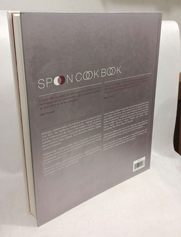 Paris, éd. De Gustibus - Alain Ducasse, mars 2004, EDITION ORIGINALE, expl. n° 312/5000, gd. in-folio, cartonnage couv. photos coul. sur fond blanc éd., emboitage carton souple photos coul. éd., 456 pp., papier glacé, très nb. photos coul. de Thomas Duval, préface d'Anthony Rowley, sommaire, index des recettes, glossaire produits, index des produits, l'équipe du Spoon Cook Book, bilingue français - anglais, Métissage, créativité, liberté : trois mots pour résumer la cuisine du Spoon Cook Book. Des recettes aux frontières abolies, mélanges de saveur d'ici et d'ailleurs pour des repas à choix multiples, où les condiments, véritables " sauces à manger " s'associent librement aux soupes, salades, spoon moments, pâtes, céréales, œufs, sandwichs, poissons, volailles, viandes et desserts. Transparences, matières, lumières : Spoon Cook Book c'est aussi la rencontre des recettes et de leur interprétation artistique au travers de 200 photographies, où les produits se mélangent et s'unissent pour sublimer la cuisine et susciter l'envie. Spoon Cook Book s'adresse définitivement aux " zappeurs gourmands ", à tous ceux qui souhaitent échapper aux figures imposées et s'ouvrir à une cuisine du désir et de la spontanéïté. Exemplaire numéroté dans l'édition "grand format" originale. TRES RARE. Très bon état