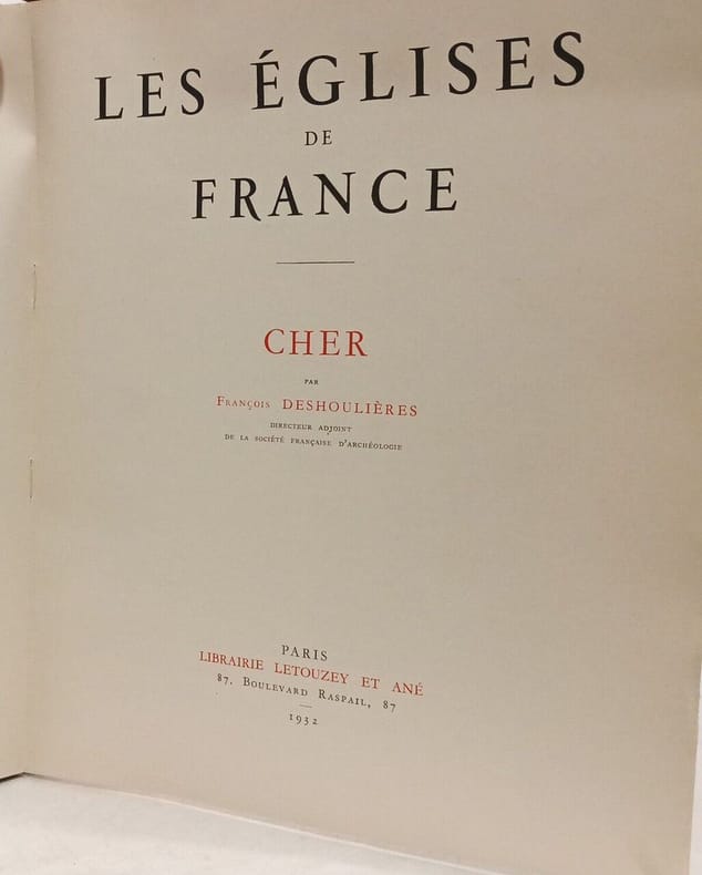 Paris, Librairie Letouzey et Ané 1932 In-4 28 x 22,5 cm. Broché, couverture grise, titre en noir et rouge sur le dos et le premier plat orné d’une vignette, VI-282 pp., bibliographies, nombreuses photos, reproductions et dessins, dans et hors-texte, dont quelques planches en couleurs sous serpentes légendées, et in fine, une carte repliée du département du Cher, table des noms d’artistes, répertoire des vocables, table des noms de lieux. Exemplaire en bon état.