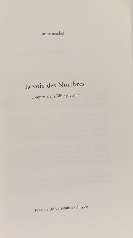 "L'enfant sait compter bien de savoir lire et de pouvoir écrire. Pour lui faciliter l'accès des textes importants, les Grecs, vers l'an mille avant Jésus-Christ, utilisent un alphabet dont les lettres sont en même temps : Signes-Sons-Nombre. Ces nombres, mis au service de la Bible grecque, aident à écouter les mots, à mieux entendre leur sens. Le message est particulier, il est universel, hier parchemin, aujourd'hui informatique. Défi lancé à l'usure des mots : les nombres paraissent magiques pour faire renaître le grec ancien. Bons serviteurs de la parole, calmes, pleins d'assurance, ils peuvent " crier " : N'aie pas peur, va, vis. Sans être " décriés " comme apprentis-sorciers." Fermeture de la Librairie du 30/12/2025 au 11/01/2026