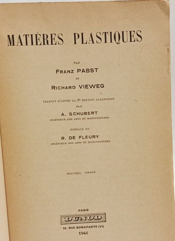 72 figures dans le texte en noir et blanc, et 15 tableaux 1ere édition Contents, Chapitres : Introduction - 1. Production des matières plastiques : Notions théoriques, classification - Les résines thermoplastiques - Les résines thermodurcissables - 2. Présentation et utilisation des matières plastiques : Les matières plastiques en tant que matières premières - Mise en oeuvre des matières plastiques, le moulage, l'usinage, assemblage, finition, décoration - 3. Technologie et contrôle des matières plastiques : Etude technique des matières plastiques les plus courantes - Contrôle des matières plastiques - Renseignements professionnels et commerciaux - Bibliographie sommaire papier legerement jauni, sinon bon etat - format de poche