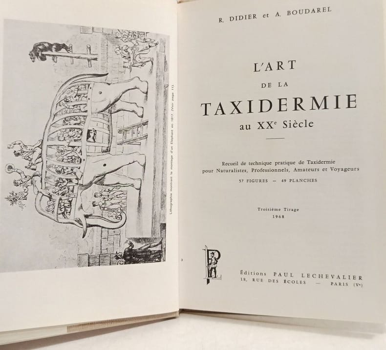Paul Lechevalier Paris 1948 In-8 ( 250 X 160 mm ) de 77-XLIX pages, demi-chagrin rouge, dos à nerfs janséniste. ( Reliure de l'époque ). Introduction par le Dr E.L. Trouessart. Frontispice, 57 figures, 49 planches h.-texte. "Recueil de technique pratique de taxidermie pour naturalistes, professionnels, amateurs et voyageurs".