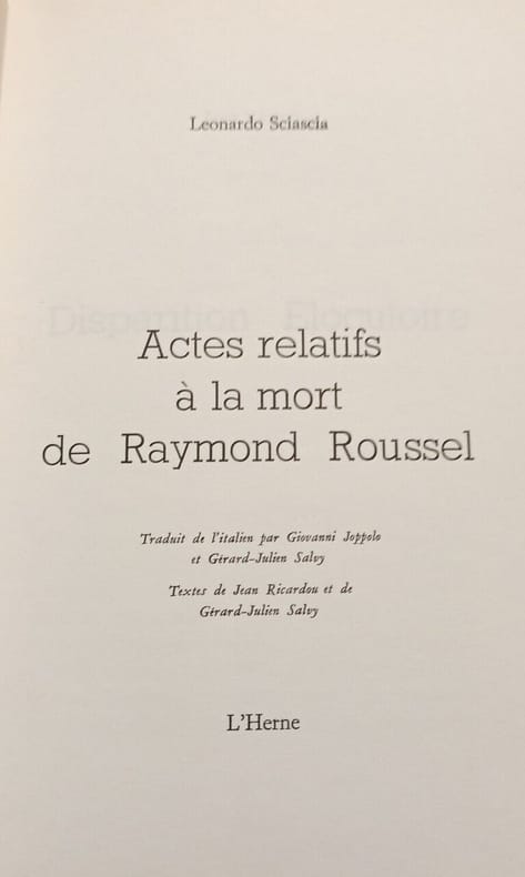 Paris L'Herne, coll. "Les Livres Noirs" 1972 1 vol. broché in-8, broché, couverture illustrée rempliée, 91 pp. Précédé d'un texte de Jean Ricardou ("Disparition élocutoire") et suivi de "Raymond Roussel une fois mort" par Gérard-Julien Salvy. Edition originale française avec un envoi autographe signé de ce dernier.