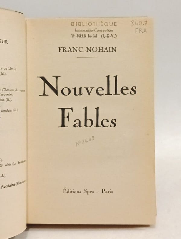 in-16, 269p. :: Edition originale. Reliure de l'époque, demi-chagrin, sans les couvertures. ENVOI signé de l'auteur à Mlle Desrochers, "avec les hommages du fabuliste".