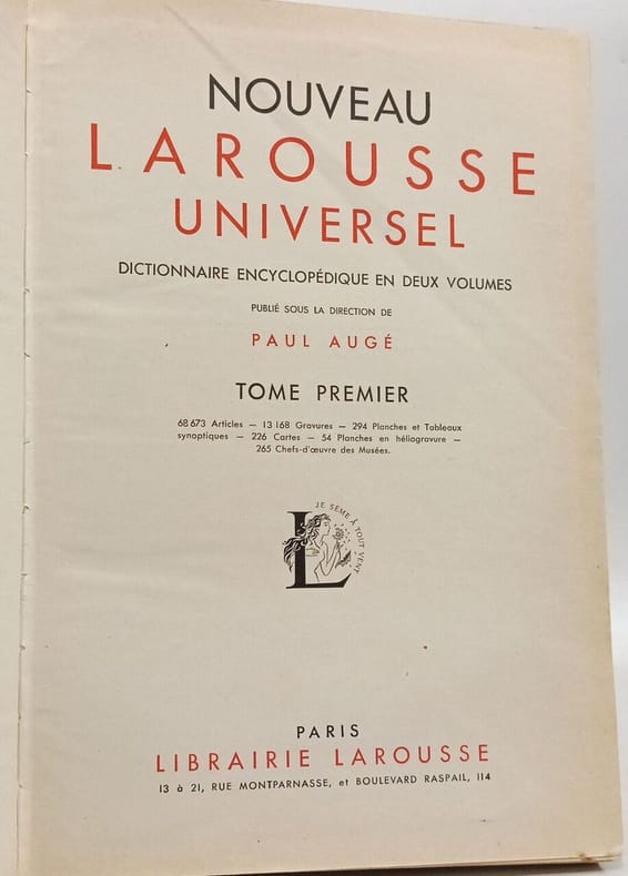 Larousse. 1949. In-4. Cartonnage d'éditeurs. Etat d'usage, Couv. convenable, Dos satisfaisant, Intérieur bon état. Dictionnaire encyclopédique en deux volumes. Tome premier : 1 092 pages de texte sur trois colonnes, coifes abimées, charnières fatiguées, plus de 69 000 articles, 12 430 gravures, 242 planches et tableaux synoptiques en couleurs et n&b, 190 cartes, 54 lanches en héliogravures, 270 chfes-d'oeuvre des musées. Tome second : 1 276 pages, dos absent, coins frottés, charnière de devant cassée, plus de 63 000 articles, 14 008 gravures, 292 planches et tableaux synoptiques en couleurs et n&b, 148 artes, 54 planches photographiques, 300 chefs-d'oeuvre des musées.. . . . Classification Dewey : 30-Encyclopédies générales