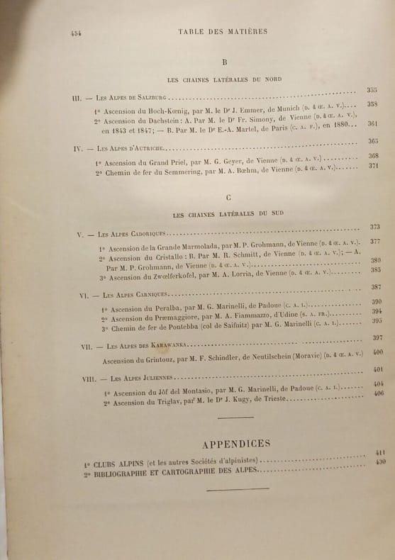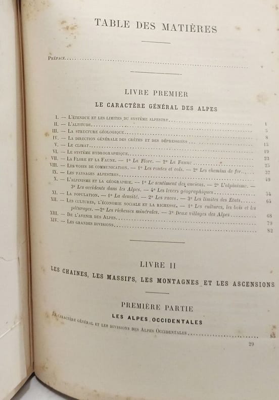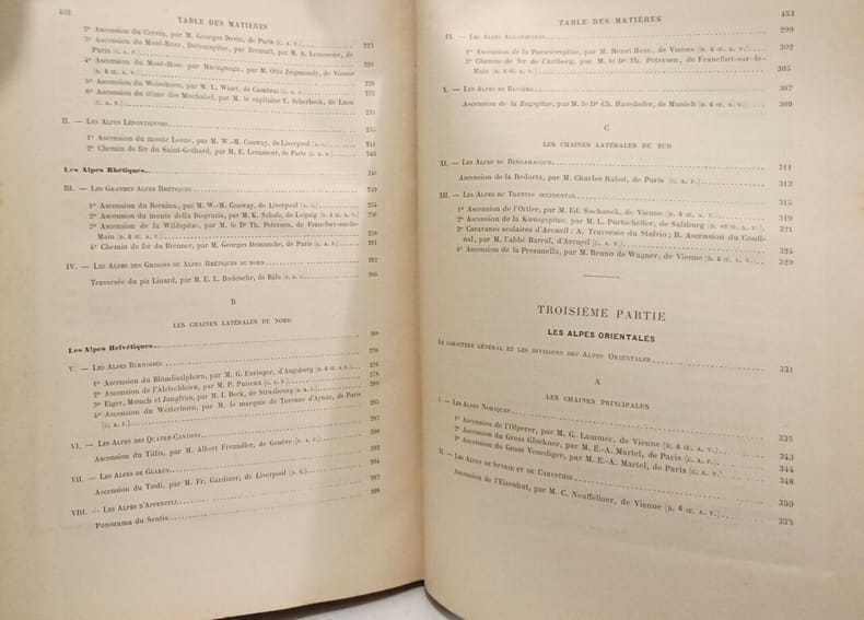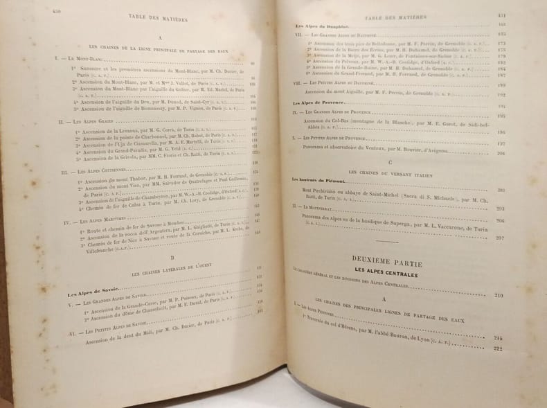 Contient : Le caractère général des Alpes - Les Chaînes, les massifs, les montagnes et les ascensions - Les Chaînes latérales de l’ouest - Les Alpes centrales - Les Alpes orientales. Bon état d’occasion