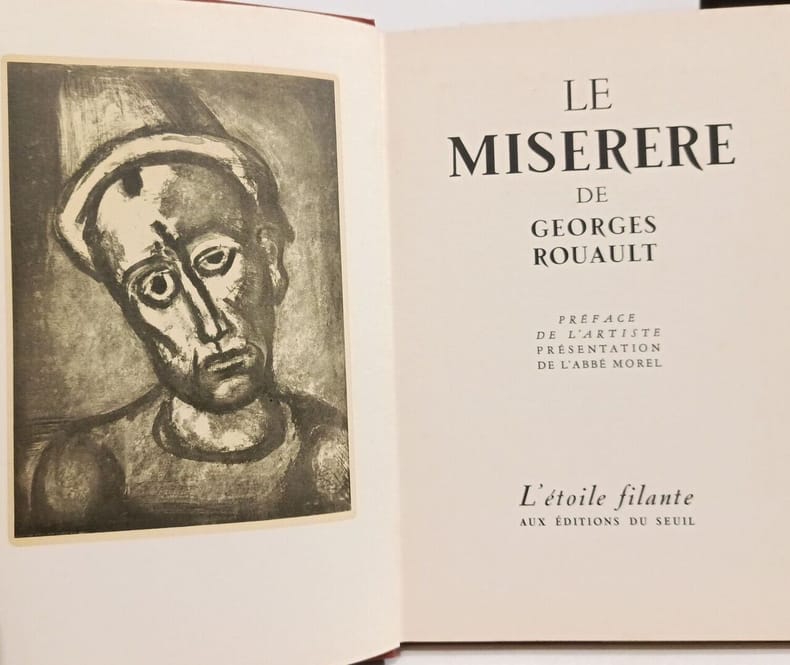 Paris, Éditions de l’étoile filante, 1948, in-plano, sous emboitage titré avec attache métallique dorée (de l'éditeur). - LA SUITE COMPLÈTE DES 58 GRAVURES DU MISERERE, L'œuvre gravée capitale de Georges Rouault. - 4 planches supplémentaires en "hélios primitives", rayées, figurent dans cet exemplaire. Elles sont titrées et monogrammées à la plume par l'artiste, et certaines sont totalement inédites. Les 58 planches en aquatinte et héliogravure de cet suite monumentale ont été gravées par Georges Rouault de 1922 à 1927 et tirées à l'époque à l’initiative d’Ambroise Vollard et conservées par lui jusqu’à sa mort. Tirage : 450 exemplaires numérotés sur vélin filigrané "Ambroise Vollard". Exemplaire de Roger Passeron dont le tirage de chaque épreuve est parfait et celles-ci conservées à l'état de neuf. Provenance d'une collection exceptionnelle. Photographies sur demande personnalisée. ——— THE COMPLETE SUITE OF THE 58 ENGRAVINGS OF MISERERE, Georges Rouault's capital engraved work. - with 4 additional plates in "primitive helios", scratched, appear in this copy. They are titled and monogrammed in pen by the artist, and some are completely unpublished. The 58 aquatint and heliogravure plates of this monumental suite were engraved by Georges Rouault from 1922 to 1927 and printed at the time on the initiative of Ambroise Vollard and kept by him until his death. Edition: 450 numbered copies on "Ambroise Vollard" watermarked vellum. Copy of Roger Passeron whose printing of each proof is perfect and these preserved in new condition. From an exceptional collection. Photographs on personalized request. The artist's engraved masterpiece. Rouault engraves as he paints, with his soul, his faith, without hindsight. The copy, from a great provenance, is in perfect condition and enriched with 4 hand-signed plates, some unique, each signed in ink by the artist.