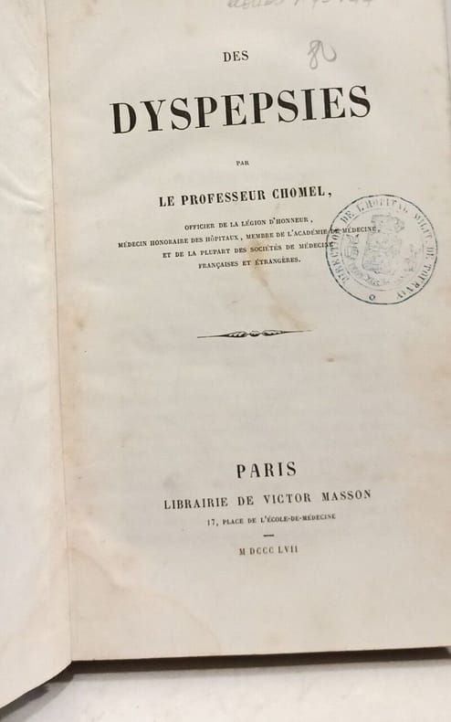 1857 Ed. Librairie Masson, Paris, 1857. 326 pages. in-8 demi-chagrin.Traité des dyspepsies accidentelles ou indigestions et des dyspepsies habituelles.