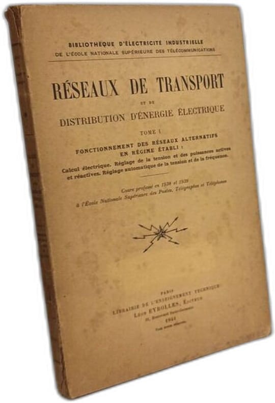 Cours professé en 1938 et 1939 à l'Ecole Nationale Supérieure des Postes, Télégraphes et Téléphones (section des ingénieurs) par l'ingénieur polytechnicien Hippolyte PARODI (1874-1968), un des précurseurs de l'électrification du réseau ferroviaire français en courant continu 1500 V.: "Calcul électrique - Réglage de la tension et des puissances actives et réactives - Réglage automatique de la tension et de la fréquence" (auteur non mentionné sauf cité dans la liste des ouvrages issus des cours professés (et vérifié à la BNF) / auteur indiqué au dos: François Cahen). Bon état sauf quelques petites marques à l'encre sur 5 pages (annotation, marques en marge ou passages soulignés) et déchirure restaurée, sans manque, à la page de faux-titre; signature et cachet d'ex-libris.