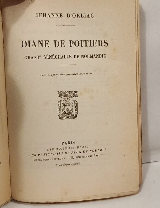 DIANE DE POITIERS Grant' Sénéchalle de Normandie Jehanne d' Orliac avec envoi autographe de l'auteur ! broché, 180x120, couvertures avec menus défauts d'usage, petit manque au dos, bon état int. 267pp. Pon 1930 ref/109