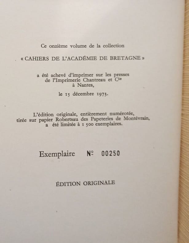 "Exemplaire n°1354/1500, édition originale sur papier Robertsau des Papeteries de Montévrain. Collection ""Cahiers de l'Académie de Bretagne"", n°11. Illustrations de Henri Bouyer et Jean Bruneau. Classification Dewey : 94.41-Editions numérotées (gros tirage)"