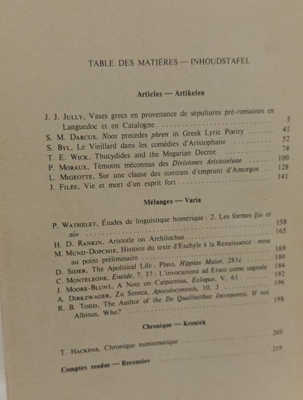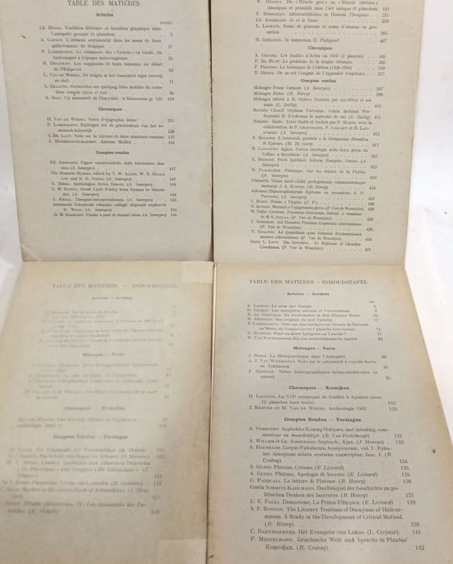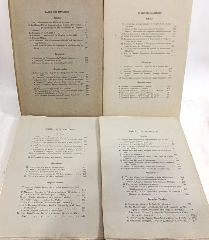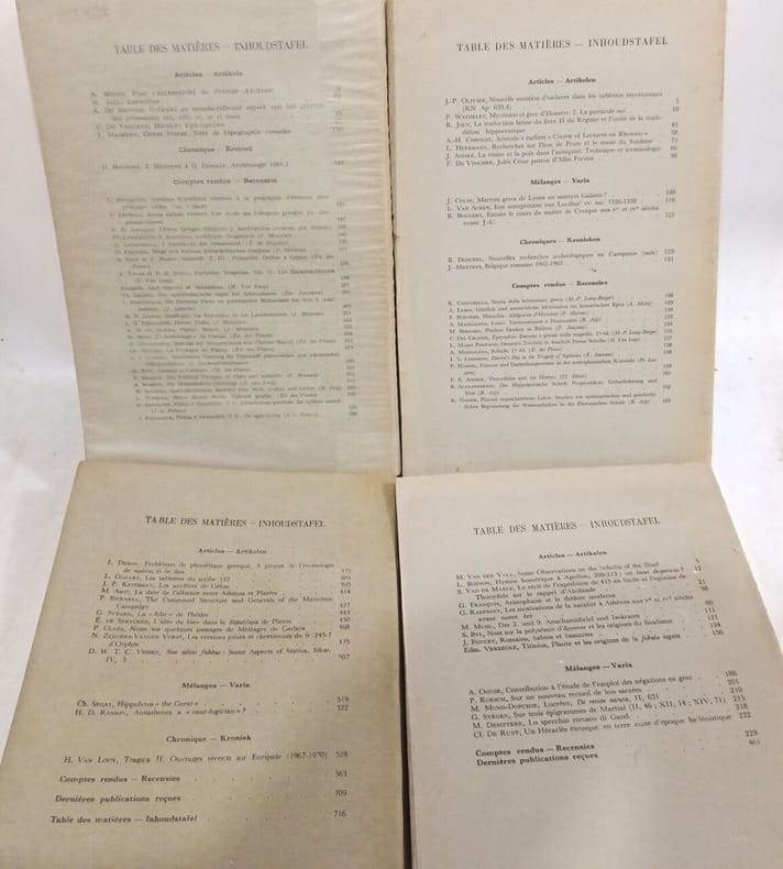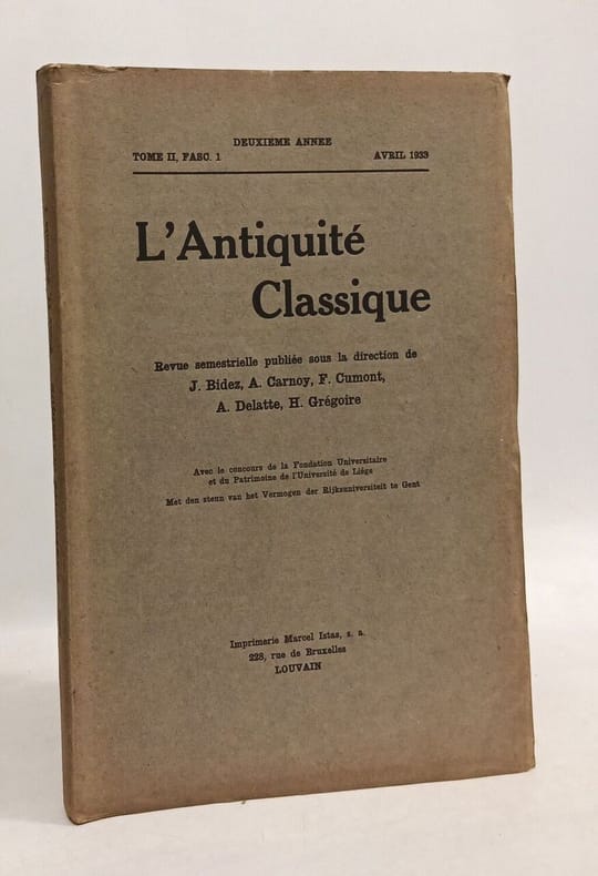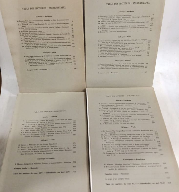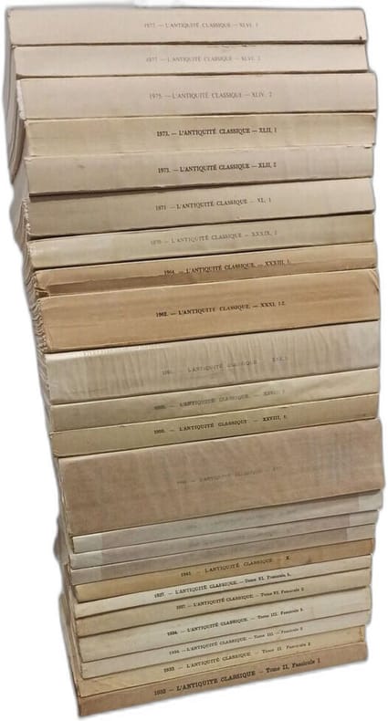 Paris: Les Belles Lettres in8. Sans date. Broché. 23 volume(s). L'Antiquité Classique - revue semestrielle - 23 volumes de 1933 à 1977 (discontinus) - T.II (fasc.1 2) + T.III (fasc.1 2) + T.VI (fasc.1 2) + T.X + T.XI (fasc.1) + T. XII + T.XIII + T.XVI + T.XXVIII (fasc.1 2) + T.XXX (fasc.1) +T.XXXI (fasc.1 2) + T.XXXIII (fasc.1) + T.XXXIX (fasc. 2) + T.XL (fasc.1) + T.XLII (fasc.1 2) + T. XLIV (fasc.2) + T.XLVI (fasc.1 2)