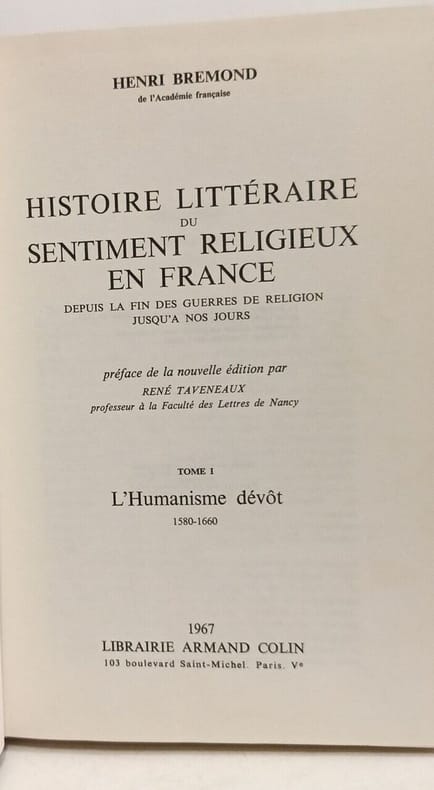 TOME 1. L'HUMANISME DEVOT (1580-1660) - TOME 4. LA CONQUETE MYSTIQUE (**) - L'ECOLE DE PORT-ROYAL - TOME 5. LA CONQUETE MYSTIQUE (***) - L'ECOLE DU PERE LALLEMANT ET LA TRADITION MYSTIQUE DANS LA COMPAGNIE DE JESUS. Classification Dewey : 270-Histoire et géographie de l'Eglise