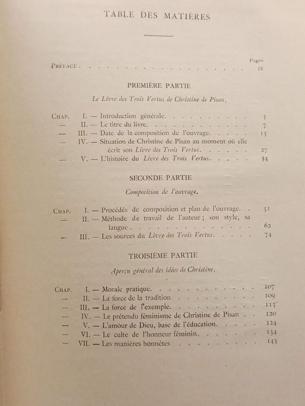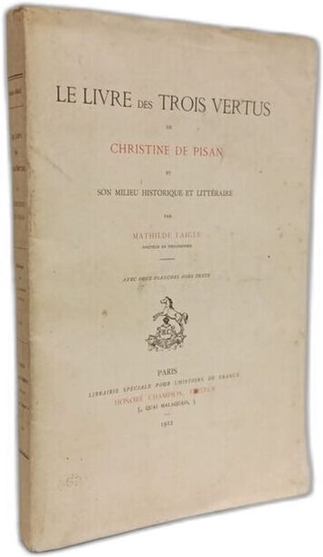 "Le Livre des Trois Vertus, souvent appelé aussi le Trésor de la Cité des Dames, est un traité d'éducation et de savoir-vivre à l'usage des femmes de toute condition, écrit probablement en 1405. Il fut imprimé plusieurs fois à la fin du XVe et au commencement du XVIe siècle. Mlle Laigle en prépare une édition critique, qui sera la très bien venue, et c'est pour servir d'introduction à son texte qu'elle a publié le présent volume. Son livre, fort bien ordonné, écrit avec élégance, est d'une lecture agréable." (Ernest Langlois, Bibliothèque de l'école des chartes, 1913)