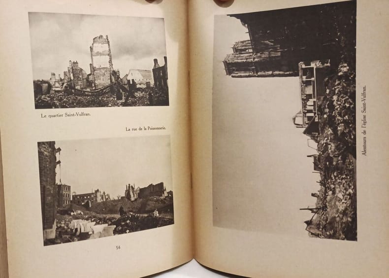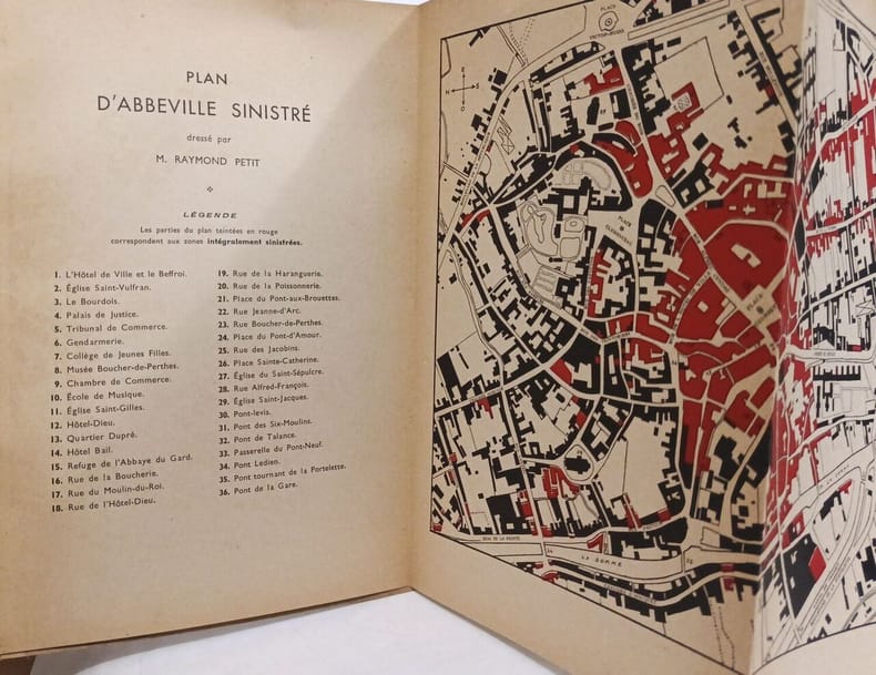 in 8 broché titre,28 pages de texte et 36 pages de photographies, un plan,d’Abbeville sinistré dressé par Raymond PETIT Abbeville imprimerie F.Paillart 1947 publication du syndicat d’initiative d’Abbeville et ses environs Très bon état