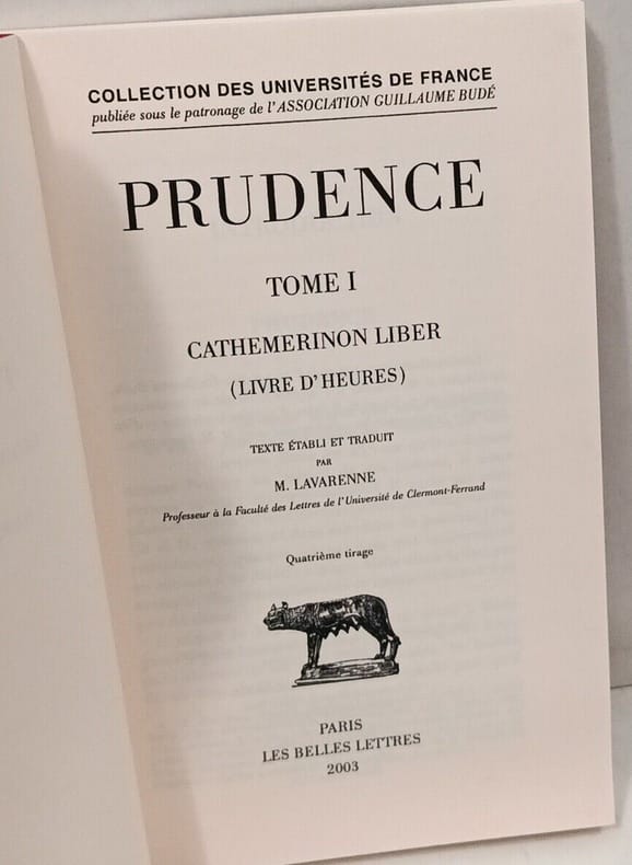 Les Belles Lettres 2003 in8. 2003. Broché. Le 'Cathemerinon Liber' de Prudence est un recueil d'hymnes chrétiennes du IVe siècle décrivant les moments de la journée et les fêtes liturgiques. Cette édition par Lavarenne aux Belles Lettres propose probablement le texte latin avec traduction française et commentaires savants