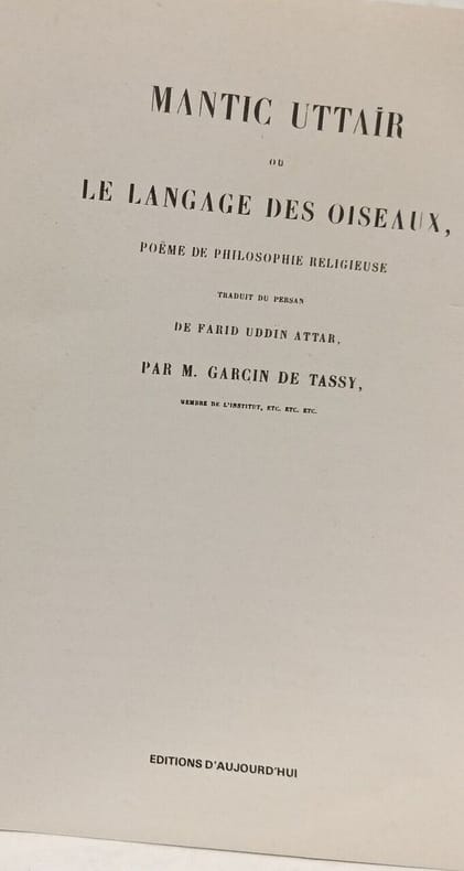 Seconde édition de la première traduction en français (accompagnée du texte en persan) de ce long poème mystique du soufisme iranien (daté de 1177) qui met en scène trente oiseaux qui se lancent à la recherche du Simorg, l’oiseau royal par lequel la vie continue sur terre... Traduction et notes de Joseph Héliodore Garcin de Tassy (1794-1878), orientaliste et indianiste qui fut l’un des fondateurs de la Société Asiatique en 1822 et titulaire de la chaire d’indologie à l’Ecole spéciale des Langues Orientales en 1828. Traduction suivie du texte en persan imprimé sur deux colonnes (composé de 4638 vers).