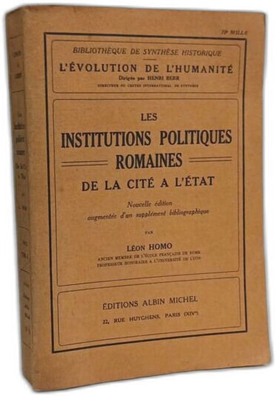 Paris Edition Albin Michel 1933 in 12 (20,5x14,5) 1 volume broché, XVI et 471 pages.(Bibliothèque de Synthèse Historique - L'évolution de l'humanité, N°18). Homo Léon, Ancien membre de l'Ecole Française de Rome, Professeur honoraire de l'Université de Lyon. Bon exemplaire