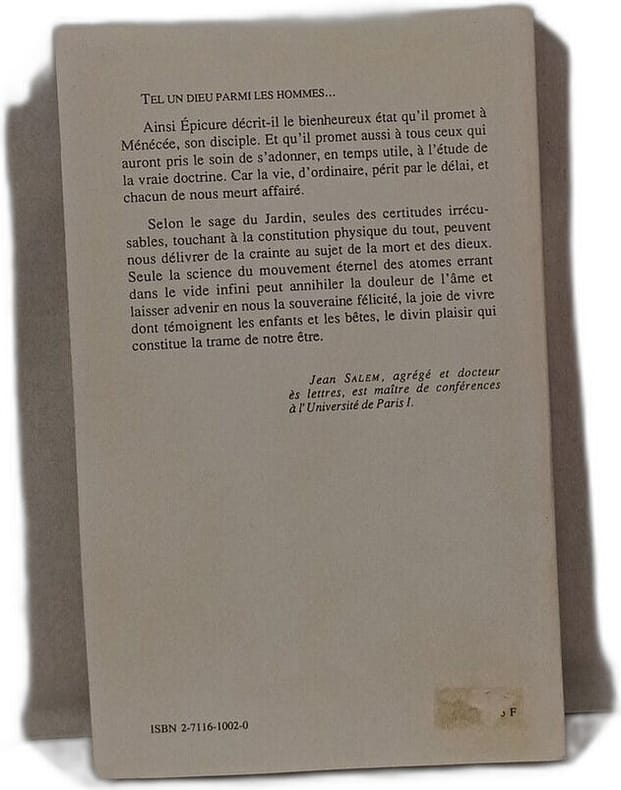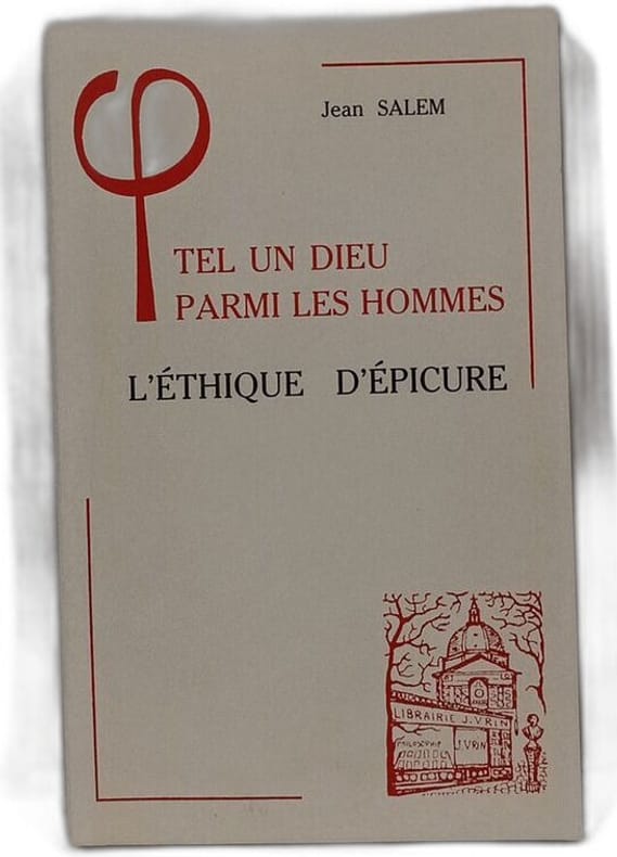Librairie J. Vrin 1989 1989. Broché. Ouvrage de Jean Salem analysant l'éthique d'Épicure et sa conception du sage vivant 'comme un dieu parmi les hommes' explorant les principes du bonheur et de l'ataraxie dans la philosophie épicurienne