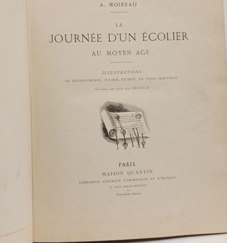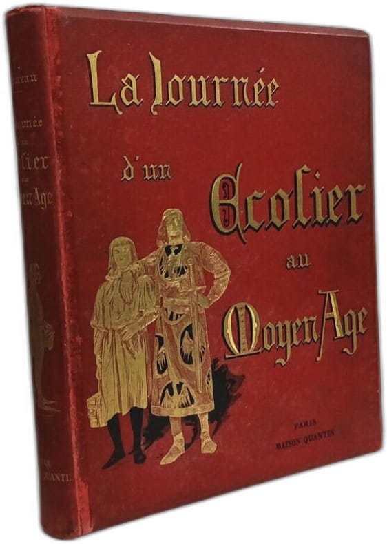 . Maison Quantin, compagnie générale d'Impression et d'édition Paris, in-4 carré pleine percaline rouge éditeur. Dos lisse avec en son centre un personnage doré. Titre doré sur le premier plat illustré par deux personnages, repris en frontispice : l'un chevalier l'autre écolier. Toutes tranches dorées. 272pp. Illustrations in et hors-texte en noir et blanc de Rochegrosse, Julien, Fichot, De Voos, Mouchot, gravées sur bois par Méaulle.Dos un peu passé sinon intérieur propre sans rousseur.