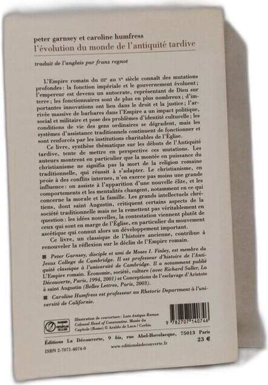 La Découverte 2004 294 pages in8. 2004. Broché. 294 pages. Ouvrage académique analysant les transformations du monde durant l'Antiquité tardive période charnière entre l'Antiquité classique et le Moyen Âge sous la direction éditoriale de Peter Garnsey