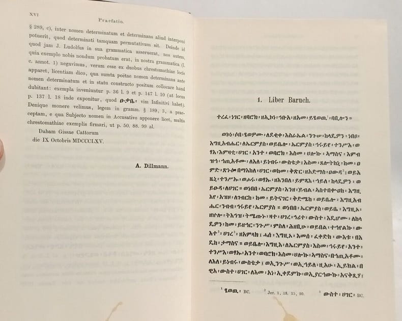 Ed. T.O. Weigel, Leipzig, 1866, 290pp. In-8. Préface et notes en latin, texte en Guèze (éthiopien ancien). Très bon état, ouvrage rerelié. Reliure demi-cuir avec dos à quatre nerfs, titrage et ornements dorés sur le dos (épidermures et coiffes arasées : voir photos), plats cartonnées illustrés, grande tranche creusée, intérieur impeccable (sans annotations ni phrases/illustrations soulignées). Bel exemplaire de cette rare édition originale.