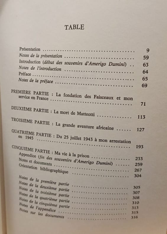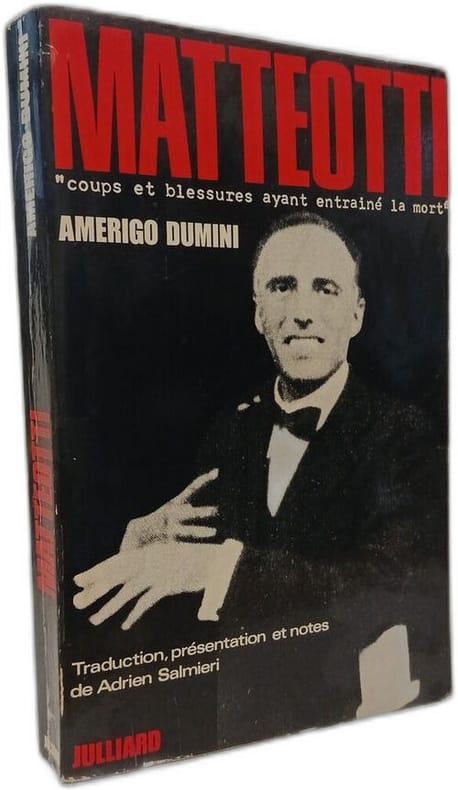 "Mémoires" d'un fasciste toscan : Amerigo Dumini a été le tueur le plus célèbre de l'Italie, assassin du député Giacomo Matteotti le 10 juin 1924, mais aussi soldat des groupes d'assaut, tueur officiel à Paris, trafiquant d'armes, journaliste, espion en Libye, intermédiaire entre maquisards et nazi-fascistes, homme de confiance des Alliés, etc. Chapitres : La fondation des Faisceaux et mon service en France. La mort de Matteotti. La grande aventure africaine. Du 23 juillet 1943 à mon arrestation en 1945. Ma vie à la prison. — "Adrien Salmieri, qui a traduit les mémoires d'Amerigo Dumini, un des hommes, qui ont participé à l'assassinat de Matteotti, a eu soin, dans une longue introduction, fondée sur une bonne connaissance de l'histoire du fascisme, de définir le climat dans lequel s'est produit ce crime politique. C'est là un des mérites de ce livre, qui rend accessible à un public français un document, qui ne manque pas d'intérêt dans la mesure où, malgré une tendance évidente de l'auteur de ces mémoires à affabuler et à dissimuler une part de la vérité, on découvre le milieu assez trouble d'une police politique supplétive, qui a largement contribué à l'installation et au maintien au pouvoir du fascisme. Dumini est un fils d'émigré italien, né à Saint-Louis du Missouri, dont l'attitude pendant la première guerre mondiale (engagé volontaire dans l'armée italienne) témoigne d'un attachement profond des colonies italiennes d'Amérique du Nord à la mère-patrie, fruit, sans doute, d'une intégration difficile dans la communauté américaine. Cette jeunesse américaine de Dumini explique, peut-être, l'attitude de l'ancien combattant qui, connaissant la réalité italienne de l'avant-guerre à travers le prisme déformé du milieu de l'émigration, est moins qu'un autre à même de comprendre les événements de l'après-guerre. Ajoutons que ces mémoires ne sont pas seulement le récit d'une participation à un crime, mais aussi de la vie d'un fasciste quelconque, roublard et maladroit (au point de se faire condamner à quatorze mois de "confino" pour injures au Duce), colon malheureux en Libye (du fait de la guerre), trafiquant d'armes pendant la République de Saló et chauffeur de l'AMGO, avant d'être arrêté par hasard." (J. P. Filippini, Revue Historique, 1974)