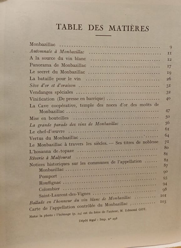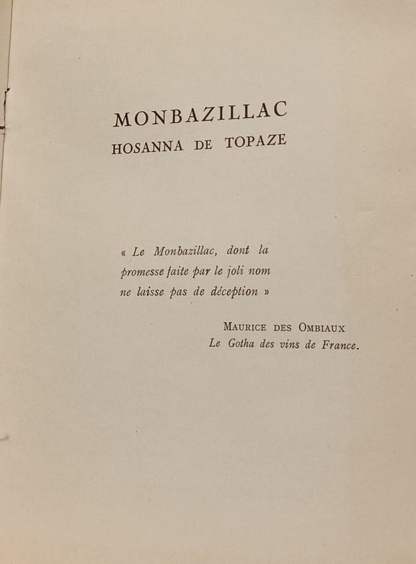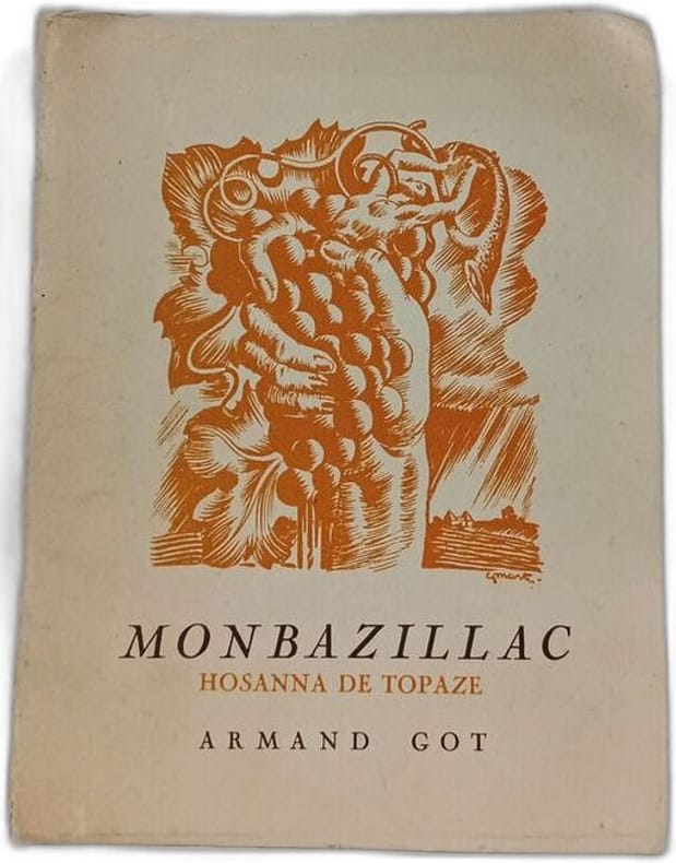Armand GOT, « Monbazillac – Hosanna de Topaze », Les Editions d’Aquitaine, Bordeaux, 1949, 102 pages+carte+table. Envoi de l’auteur en page de faux titre. Couverture par Gaston Marty, Photographies de Rodolphe Germain, Carte de Eric Kuntzel. Broché. Rousseurs en couvertures. Intérieur très bon. Nombreuses photos noir et blanc.