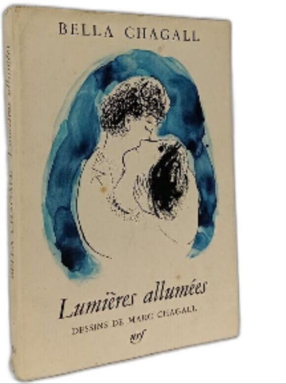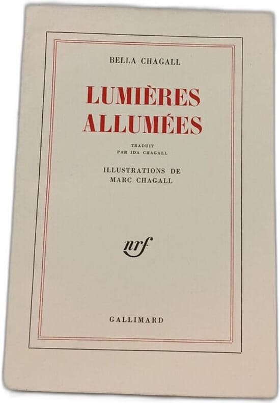 Dessins de Marc Chagall. Première édition française, traduite par Ida Chagall, avec une envoi autographe de celle-ci à une amie. Son réunis ici Lumières allumées et Première rencontre, écrits en yiddish de 1935 à 1944, date de la disparition prématurée de Bella Chagall.