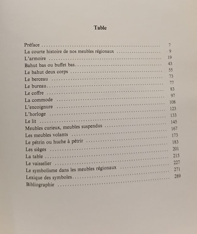 L'auteur a classé les meubles par type (armoire, bahut, coffre...) et a tenté de singulariser les caractéristiques de chaque région. Ce dictionnaire est complété par un intéressant essai sur la symbolique dans les meubles régionnaux, augmenté d'un lexique des symboles.