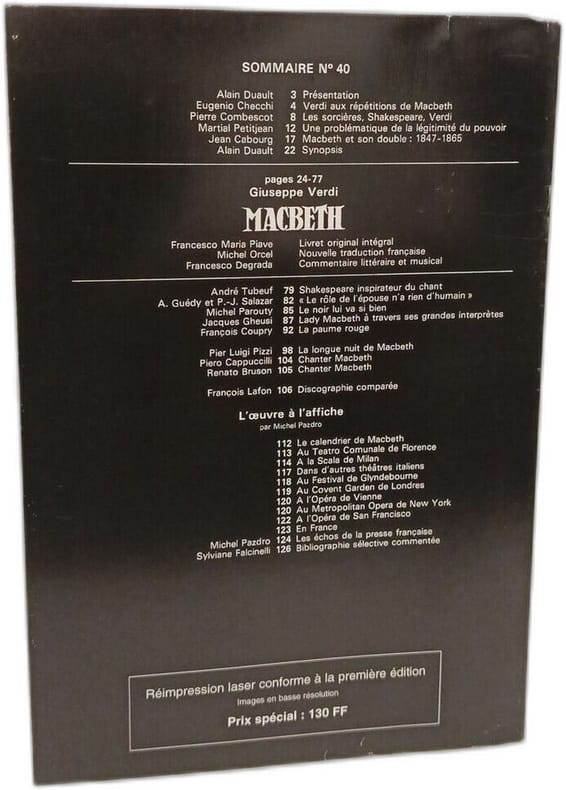 Sommaire : Verdi aux répétitions de Macbeth / les sorcières, Shakespeare, Verdi / une problématique de la légitimité du pouvoir / livret original intégral / le noir lui va si bien / la longue nuit de Macbeth / la paume rouge... Classification Dewey : 790.2-Arts du spectacle (Généralités)