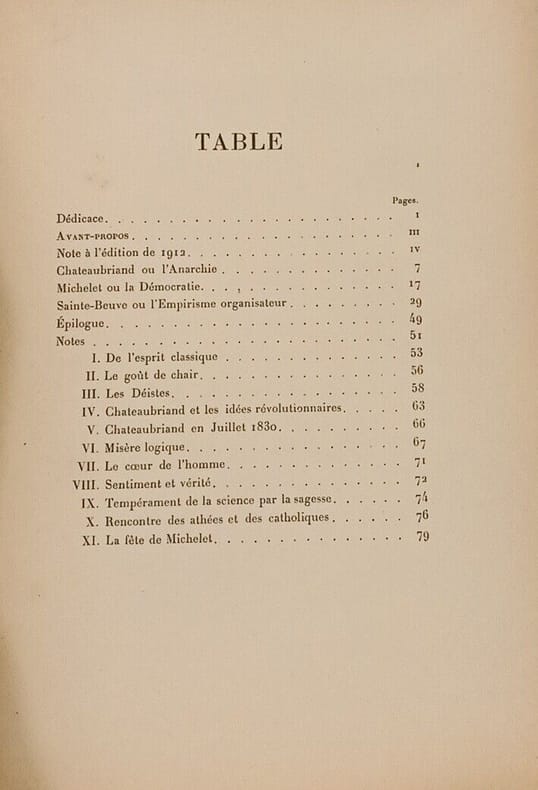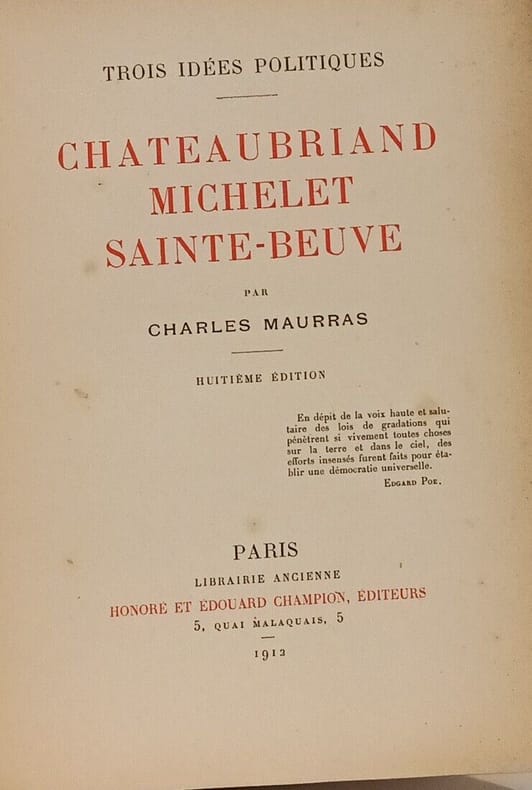 Chateaubriand ou l'anarchie - Michelet ou la démocratie - Sainte-Beuve ou l'empirisme organisateur. Réédition en 1912 (la deuxième avec une note à l'édition de 1912) d'un petit ouvrage de 1898 qui fait référence aux discours officiels pour la commémoration liée à chacun des auteurs sujets de cette brochure. ˮJe dirais quel sens politique peut-être sans erreur prêté à leurs ouvrages.ˮ A son point de vue: Chateaubriand est néfaste car faussement traditionnel; Michelet est nuisible car corrupteur de la jeunesse mais Sainte-Beuve trop méconnu est un modèle pour l'avenir.