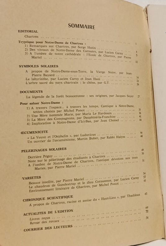 Peu d'établissement humain, en vérité, ont, autant que Chartres, été marqués du sceau religieux et sacerdotal, et plus précisément marial. Ici, au coeur de cette région beauceronne d'entre Seine et Loire aux eaux peut-être jadis mêlées, depuis des temps et des temps déjà, lorsque ce répandit la Bonne Nouvelle, chaque année, au fond du hallier de chênes rouvres, la théorie processionnelle druidique venait de toutes part commémorer Ram le Celte et célébrer très spécialement la Déesse Mère.La cathédrale... cinq fois bâtie et détruite, par le feu ou par la foudre, la cathédrale, témoin de tant de pages vécues ici de l'histoire du pays, la cathédrale illustrée d'une manière ou d'une autre part tant de personnages hors du commun. Chartres... Notre-Dame... "commencement et fin " du Temple solaire de toujours... sanctuaire de la Mère... la Mère... la Mère sans cesse ici continuée......