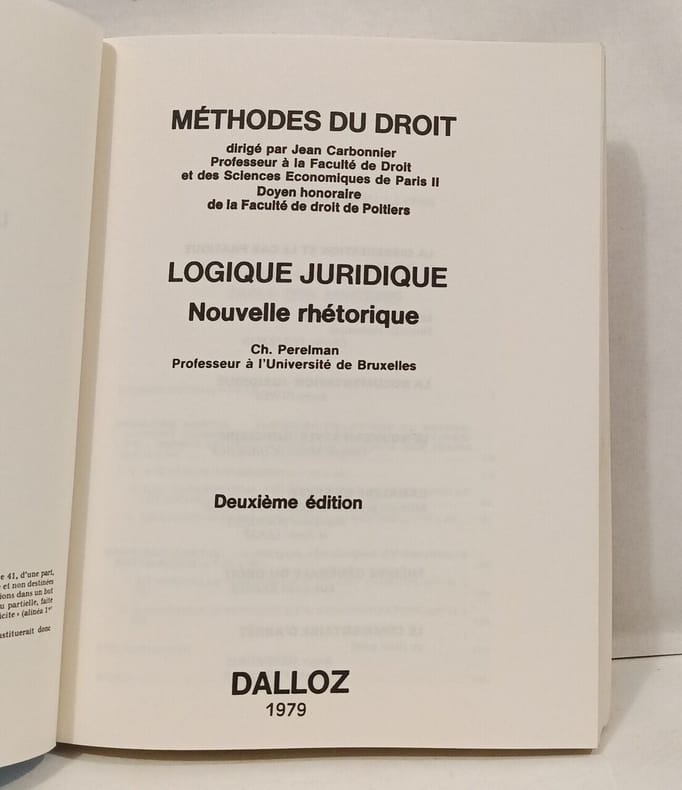 Dalloz 1979 in8. 1979. Broché. Cet ouvrage de Chaïm Perelman réédité dans la collection 'Méthodes du droit' présente une réflexion fondamentale sur la logique juridique. Il résume la théorie de l'argumentation de l'auteur renouvelant les bases de la logique juridique en étudiant l'évolution historique de la pensée depuis le XIXe siècle et en analysant systématiquement les techniques de raisonnement et d'argumentation en droit