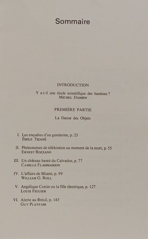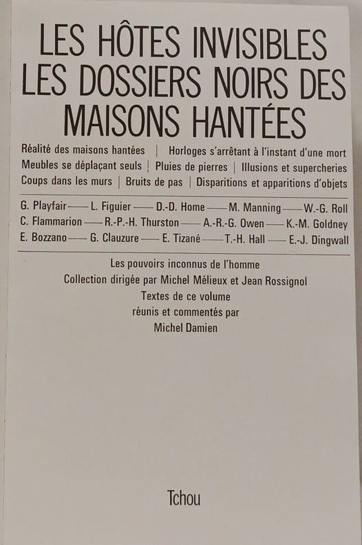 Paris, Tchou , 1978 ; in-8, 312 pp., cartonnage de l'éditeur. Réalité des maisons hantées, horloges s'arretant à 'instant d'une mort, meubles se déplacant seul, pluies de pierres, illusions et supercheries, coups dans les murs , bruits de pas, disparitions et apritions d'objets.