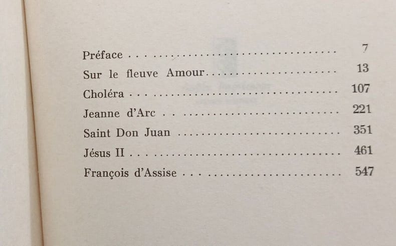 Paris Grasset 1977 in 8 (22,5x14) 1 fort volume broché, couverture à rabats, 695 pages [3]. Sur le fleuve amour; Choléra; Jeanne d'Arc; Saint Don Juan; Jésus II; François d'Assise. Bel exemplaire ( Photographies sur demande / We can send pictures of this book on simple request )