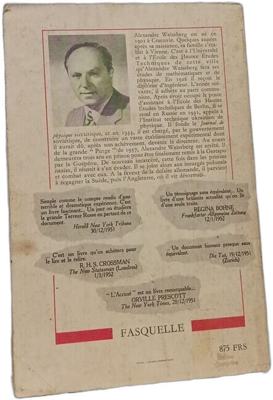 Pasquelle 1953 in8. 1953. Broché. L'Accusé d'Alexandre Weissberg est un témoignage de premier ordre sur les grandes purges staliniennes de 1936-1938 en URSS. L'auteur physicien autrichien et ancien communiste y relate son expérience personnelle après s'être rendu en Union soviétique en 1931