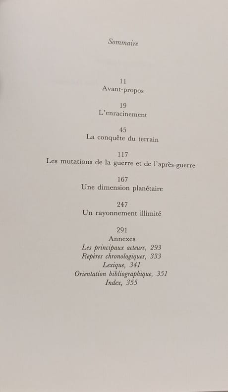23 planches hors-texte d'illustrations en couleurs et 16 planches de photographies en noir et blanc (complet) édition de 1988 Contents, Chapitres : Avant-propos - L'enracinement - La conquête du terrain - Les mutations de la guerre et de l'après-guerre - Une dimension planétaire - Un rayonnement illimité - Annexes, principaux acteurs, repères chronologiques, lexique, orientation bibliographique et index jaquette à peine jaunie sans gravité sinon bel exemplaire, intérieur frais et propre, bien complet de toutes les planches hors-texte d'illustrations