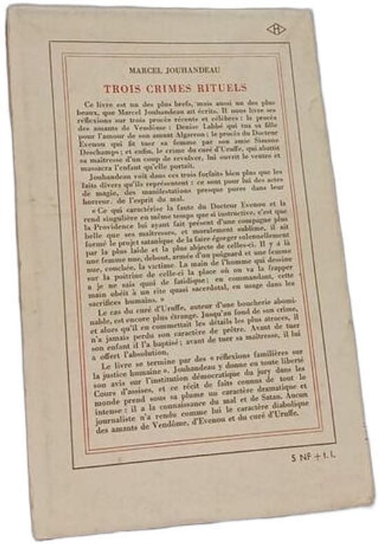Gallimard 1962 in12. 1962. Broché. Dans cet essai publié en 1962 Marcel Jouhandeau analyse trois crimes célèbres des années 1950 qui défrayèrent la chronique. Il y voit bien plus que de simples faits divers les interprétant comme des actes rituels et des manifestations de l'esprit du mal où l'amour paradoxalement conduit au crime