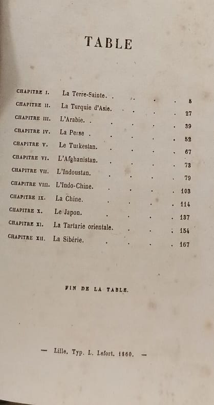 L. Lefort Imprimeur - Libraire in12. Sans date. Cartonné. Ouvrage du XIXe siècle (1882) qui compile et synthétise les récits des voyageurs les plus célèbres ayant exploré l'Asie. Il couvre de nombreuses régions asiatiques dont la Terre Sainte la Turquie le Turkestan l'Afghanistan l'Indoustan l'Indochine la Chine le Japon la Tartarie et la Sibérie