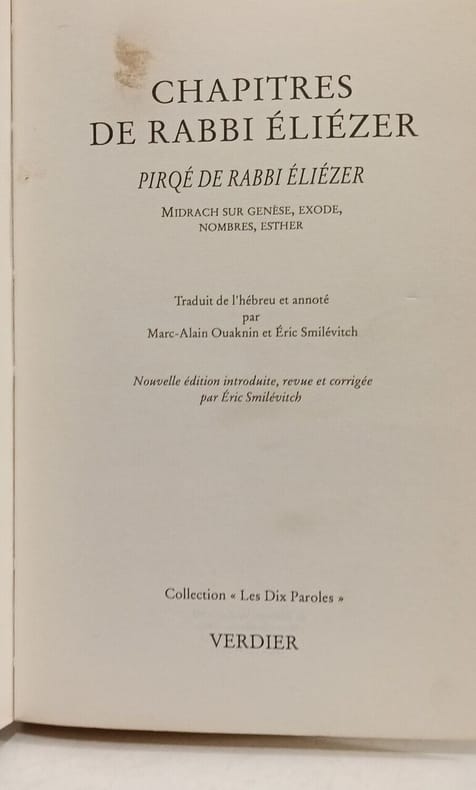 VERDIER 1992 384 pages 14x3 4x21 2cm. 1992. Broché. 384 pages. Traduction française annotée des 'Chapitres de Rabbi Éliézer' une importante somme de commentaires midrachiques se rapportant principalement aux livres de la Genèse et de l'Exode. L'ouvrage est publié dans la collection 'Les Dix Paroles' des éditions Verdier
