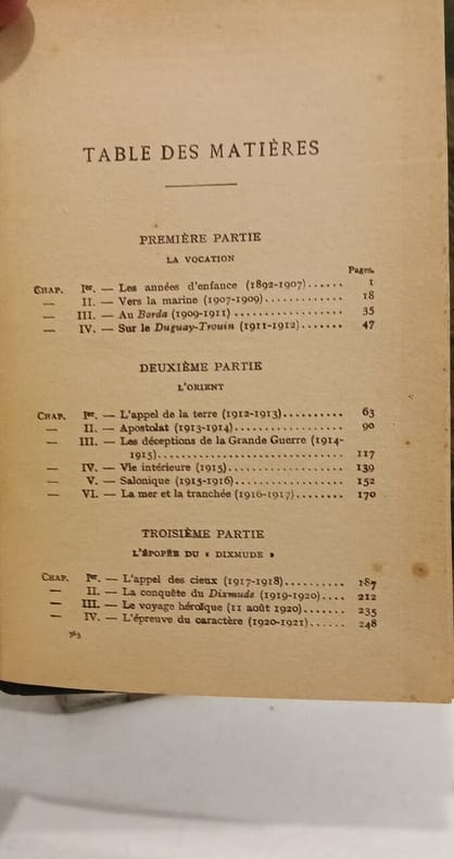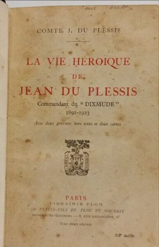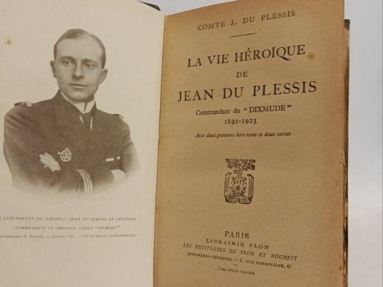Portait de J. Du plessis en frontispice, une repro. photo du Dixmude hors-texte et deux cartes sur un feuillet dépliant hors-texte. Ce fils d'une famille de magistrats, originaire de la Loire-Atlantique, insatllée à Angers à partir de 1900, deviendra officier de marine. Il servira pendant la première geurre aux commandes du dirigeable Dixmude qu'il parviendra à sauver du démentellement après 1919. En octobre 1923, peu de temps avant l'accident qui lui sera fatal, il passe avec son aéronef au dessus de Moulins et jette un pavillon tricolore sur le monument commémoratifs de l'accident du dirigeable République qui s'était écrasé à cet endroit en 1910. Le Dixmude et son équipage ont péri, abbatus par un violent orage, au dessus des côtes de Sicile le 21 décembre 1923.