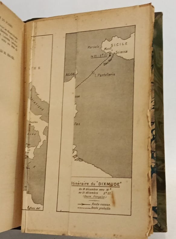 Couverture imprimée en rouge et noir, date sur le dos 1925 ; 350pp ; illustré de 2 photogravures HT (une en frontispice : portrait du lieutenant de vaisseau Jean du Plessis de Grenédan, commandant le croiseur aérien "Dixmude" et l'autre représentant le "Dixmude" au dessus du centre de Cuers) et 2 cartes en une planche dépliante HT ; Le dirigeable explosa en vol près de la Sicile après un périple en méditérannée (Corse, Algérie, Tunisie) ; intéressant récit